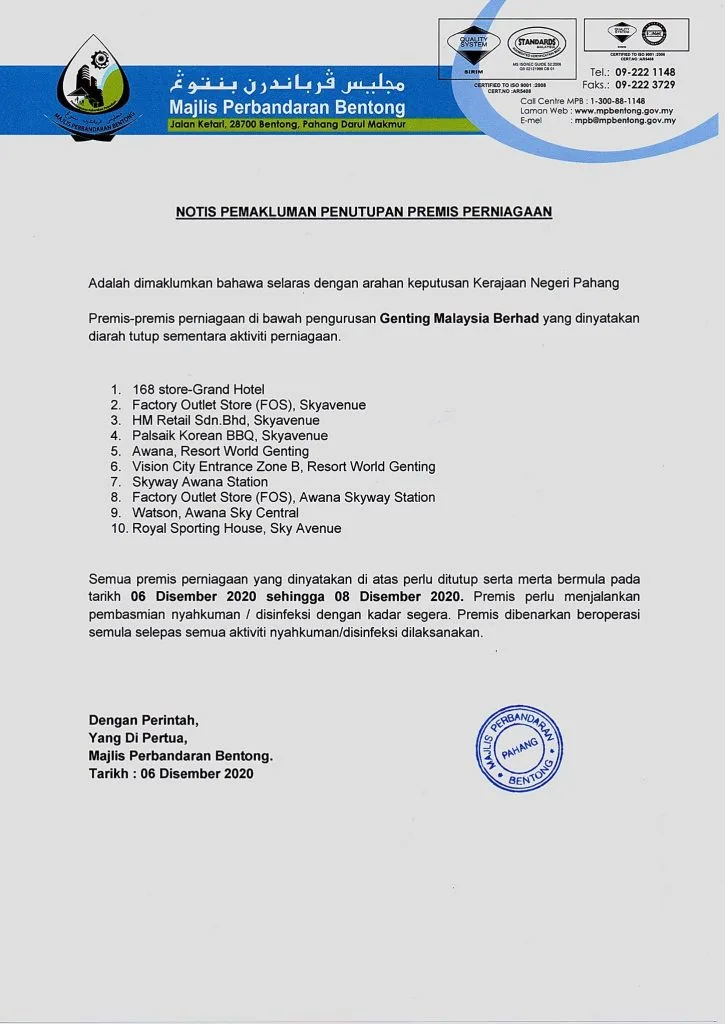 Other venues in Genting Highlands that have also been ordered to temporarily close is listed below: