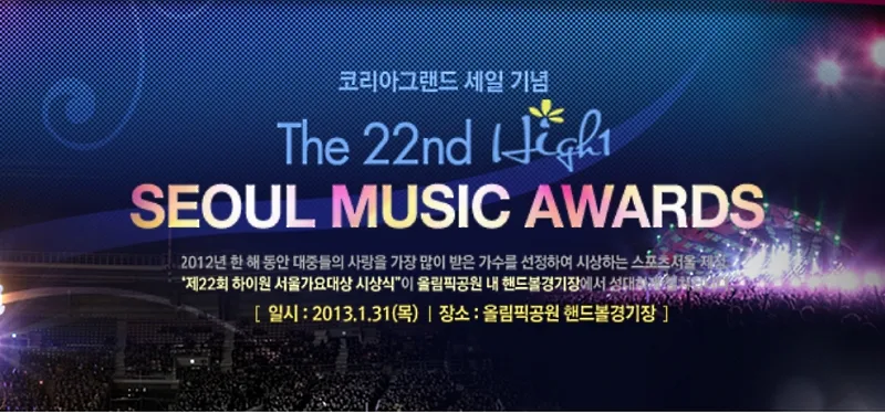 This year, the 22nd Seoul Music Awards will take place at the Handball Stadium, Olympic Park on 31st January 2013 (that’s today!) at 7pm. K-Pop idols/idol groups that are currently in the running to bag an award (or two) are:
