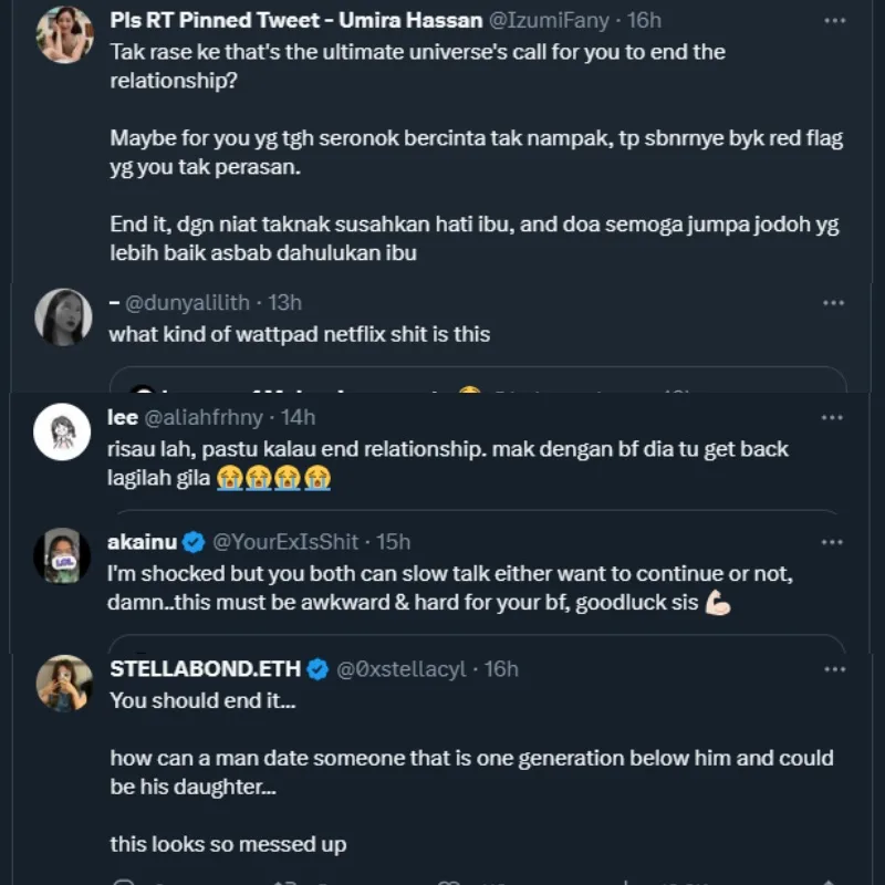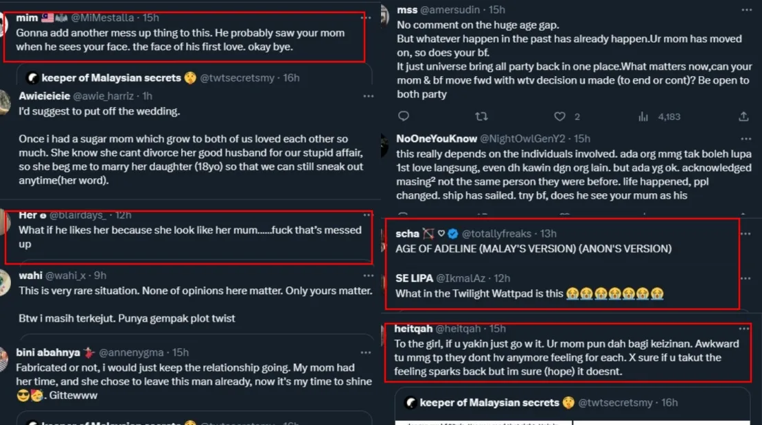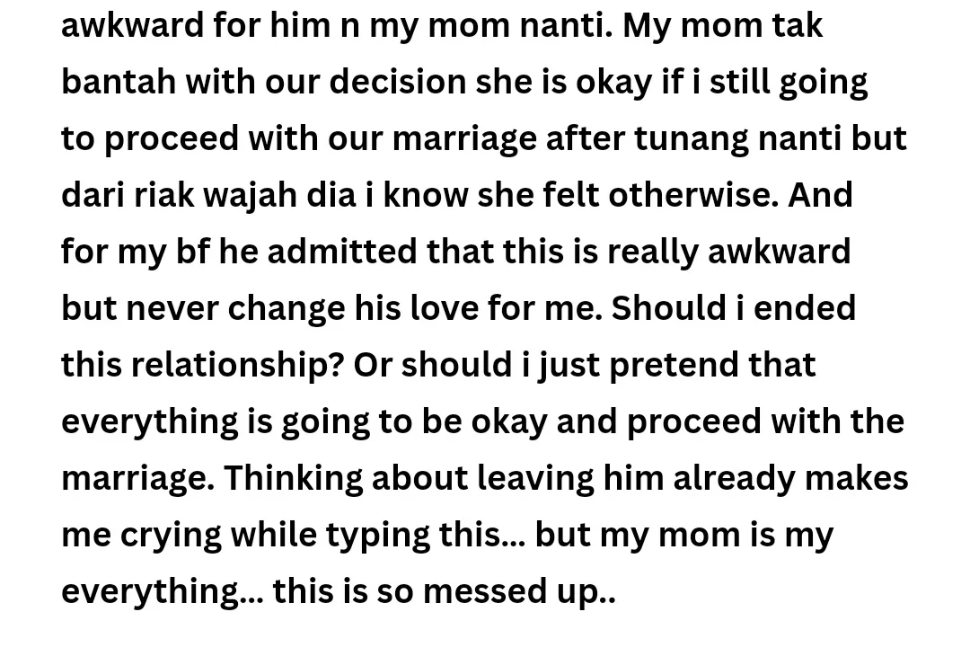 The ex-lovebirds called off their relationship as they were too busy dealing with their own personal issues in their 20s. While the woman’s mother claimed to be okay with the marriage going forward, the submitter herself seems troubled by the revelation as she foresees things getting increasingly awkward in the future. The Twitter user is considering ending the relationship but can’t bear the thought of not having her soon-to-be husband in her life.