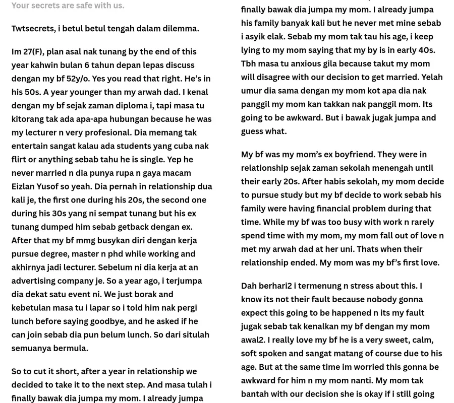 Yesterday (Monday, 18th September), an anonymous woman submitted a confession to the Keeper of Malaysian Secrets Twitter page. In her submission, the 27-year-old detailed that she’s been in a loving relationship with her 52-year-old boyfriend, who was apparently her lecturer during her study years.