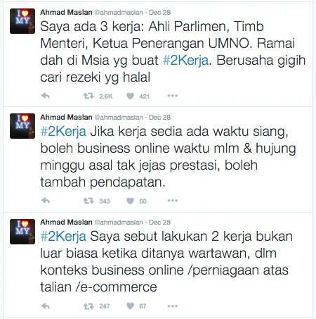Ahmad Maslan later retracted his “suggestion” after #2Kerja blew up on social media and said that he meant it “in the context of having an online business on top of a day job”.