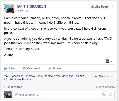 Local comedian Harith Iskander also took to his Facebook page to give his 2 cents on “2 Kerja”. The man has a point, we say: