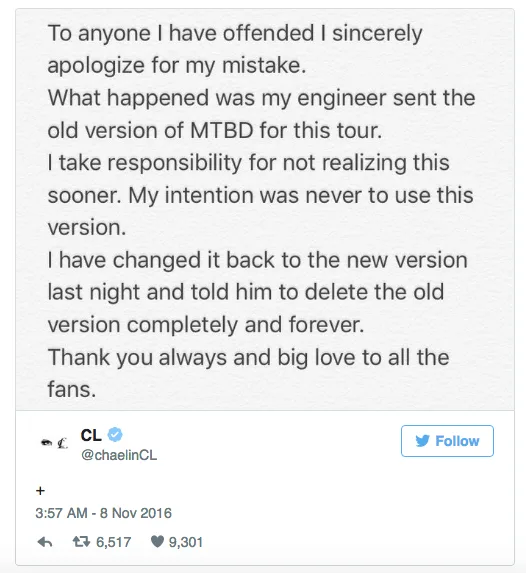 “To anyone I have offended I sincerely apologize for my mistake. What happened was my engineer sent the old version of ‘MTBD’ for this tour. I take responsibility for not realising this sooner. My intention was never to use this version,” she wrote.