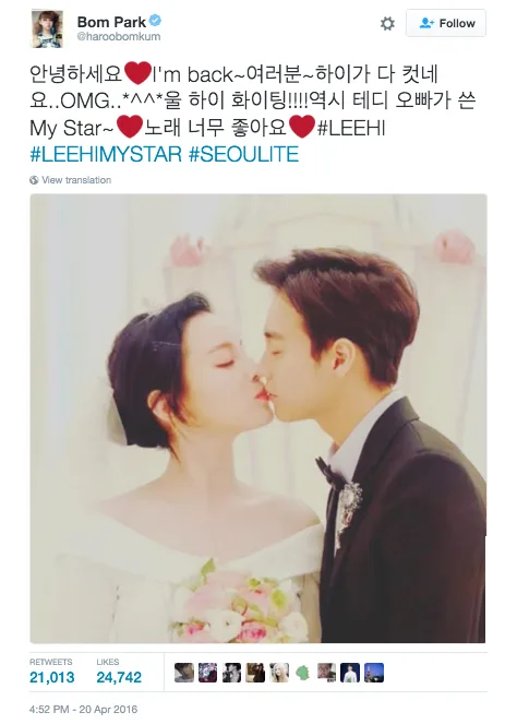 Minzy chose not to re-sign with YG Entertainment after 2NE1’s contract ended on 5th May 2016. As such, 2NE1 will go on as a 3-member group. The talent agency also said that 2NE1 will be making a comeback this summer with the remaining members CL, Dara, and Park Bom. Which explains why Park Bom is suddenly back on Twitter!