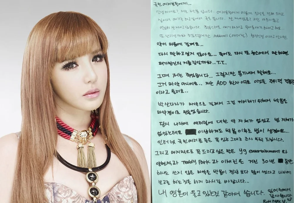 The vocalist wrote in the letter, “It (Adderall) is not a drug. I am an ADD patient, something called Attention Deficit Disorder. Sandara Park was caught for drug abuse, and to cover that up, they turned the medication into something labelled as a drug scandal involving me. At the time, there wasn’t even a specific medication system or law in this country regarding Adderall, but strangely, after Park Bom, a law was created.”