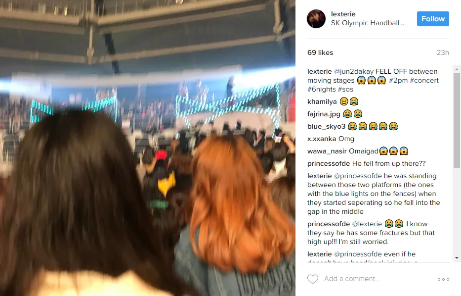 Jun.K was allegedly standing in the middle of 2 platforms when the incident happened. Fans who were at the concert claimed that there was a signalling issue with the staff, which resulted in Jun.K walking to the middle of the platform although the stages were moving. The gap between the stages grew and the singer lost his balance, falling headfirst to the ground.