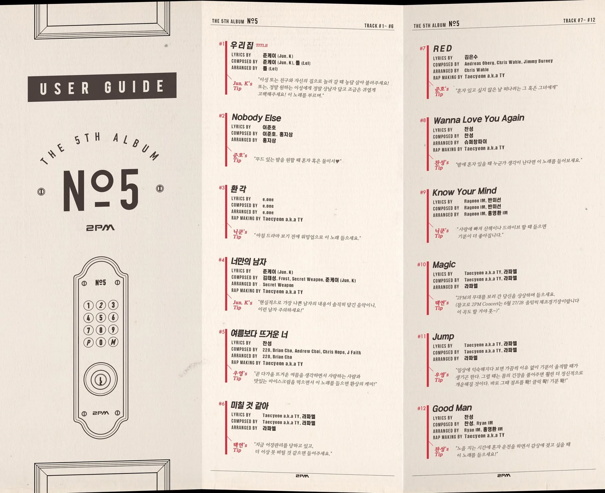 In anticipation for 2PM’s comeback, JYP Entertainment has released the track list for the group’s upcoming album, “No.5”. The track list looks like a restaurant menu at first sight, but upon closer inspection, one can see that it has the words “User Guide” written at the top left of the photo. The track list also offers tips from the members on how to enjoy the songs.