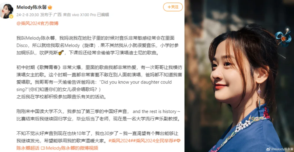 “It has been almost 10 years since “The Voice” and I am 30 years old,” Melody mused in her Weibo post. “I have always longed for a stage where I can continue to shine, and hope to warm everyone with my singing.” Melody included clips of her time on “Sing! China”, capturing her impressive voice range.