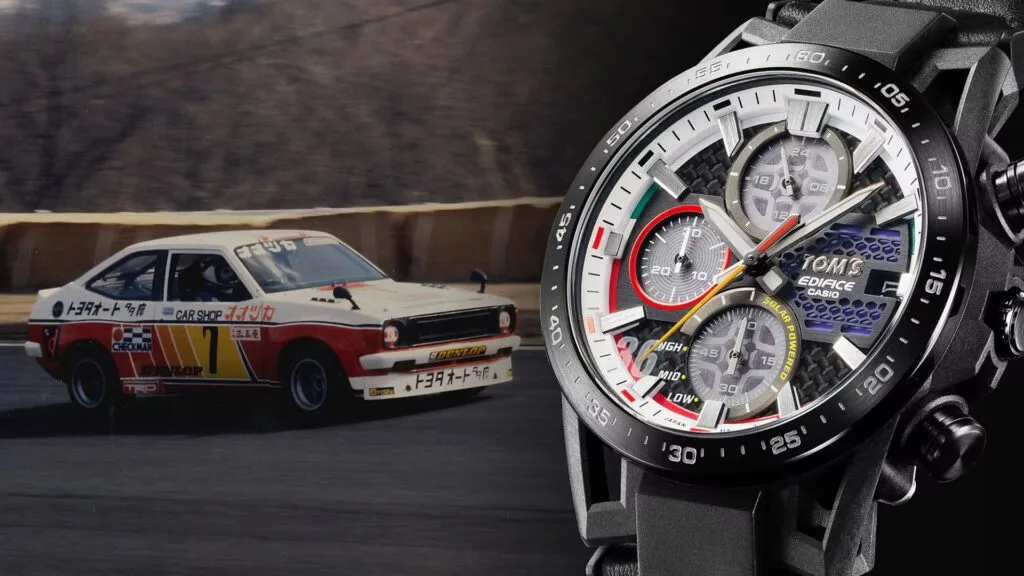 The newest timepiece in Casio’s EDIFICE collection honours the TOM’s KP47 Starlet, a legendary race car driven by the Japanese racing team that set numerous records during the 1970s.