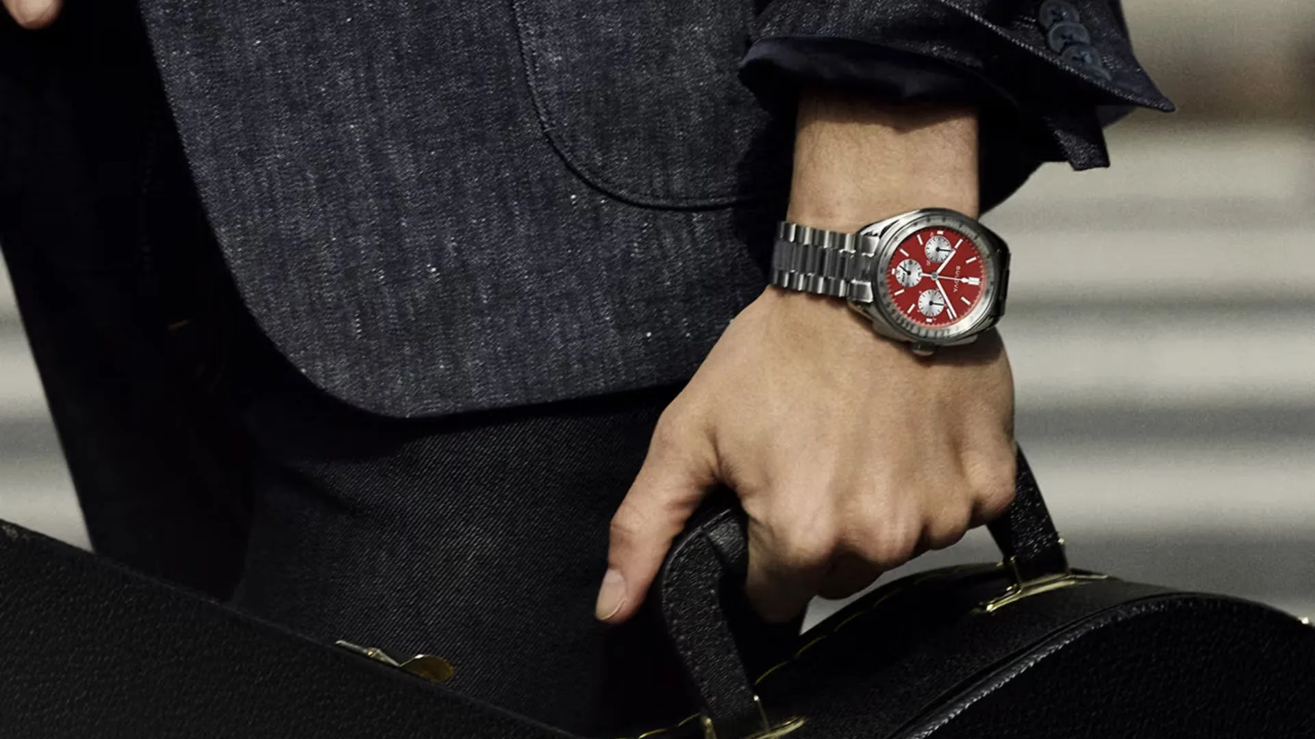 As its name suggests, this timepiece boasts a scarlet dial that nods to the reddish tinge of an actual Blood Moon. Upon closer inspection, the dial has a faint, textured pattern that resembles the lunar surface. From a distance, the vivid watch face – which is complemented by a silver-tone tachymeter and subcounters – looks even more striking because it’s housed in a stainless steel case that matches the bracelet.