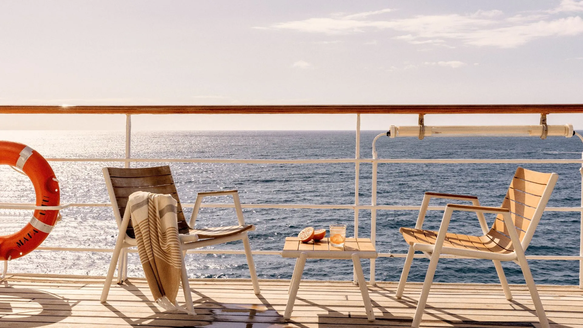 The lounge features a refined mix of maritime nuances such as ropes and stainless-steel fittings, haloed by a majestic chandelier as a sophisticated centrepiece. At the upper deck, guests are greeted by clean lines and coastal-inspired prints surrounding comfortable summer lounges that welcome serenity and silent contemplation.