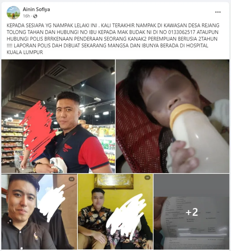 A woman who goes by Ainin Sofiya posted on her Facebook, seeking help from others to locate a 30-year-old man accused of abusing the17-year-old girlfriend’s 2-year-old daughter. According to her post, the man was last seen around the Desa Rejang area. “A police report has been filed and both the child and mother are in the hospital at the moment,” the netizen wrote.
