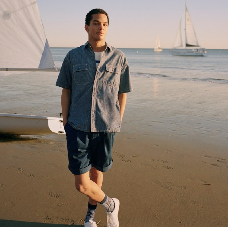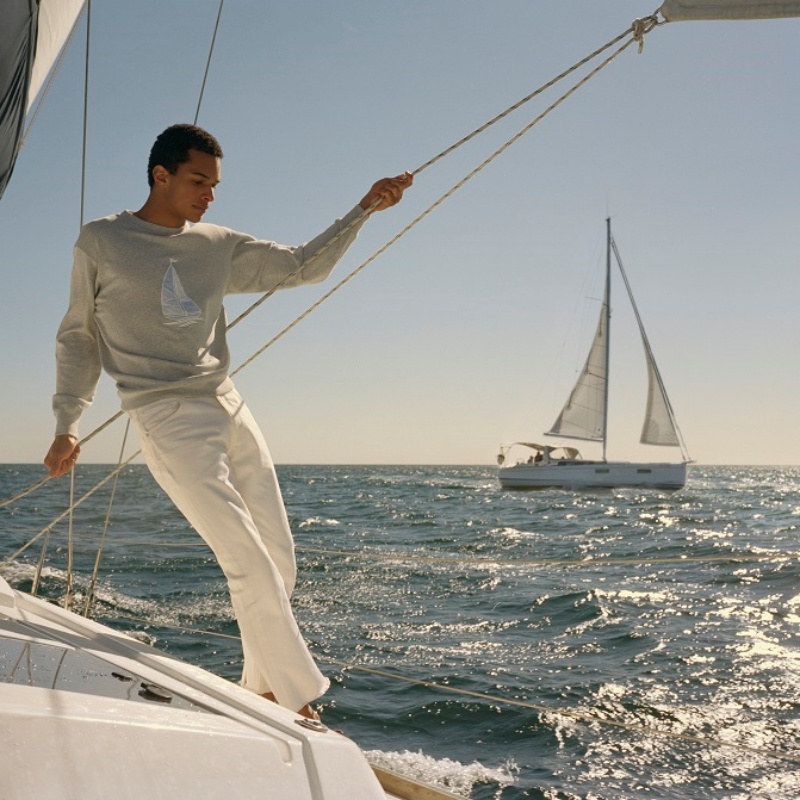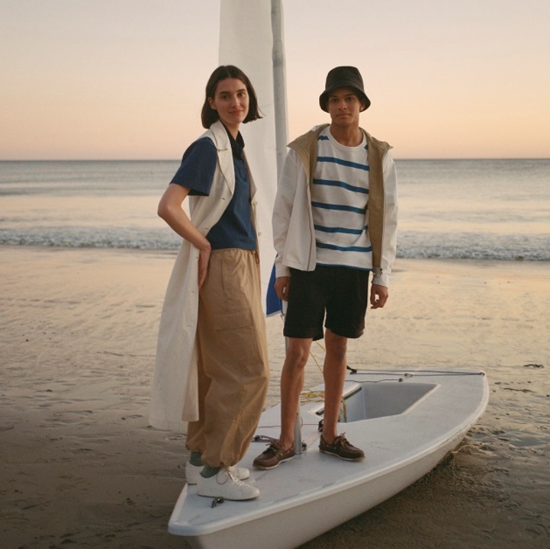 The rich heritage of Britain’s sailing and seaside culture inspires this season’s concept of At Home with the Sea. The collection combines the evolving simplicity and quality of LifeWear with JW ANDERSON’s playful craftsmanship. The lineup features shirts, caps, and socks with embroidered sailboats in playful hues, as well as a knot dress and yacht parkas that look great against the blue backdrops of the sea and sky.