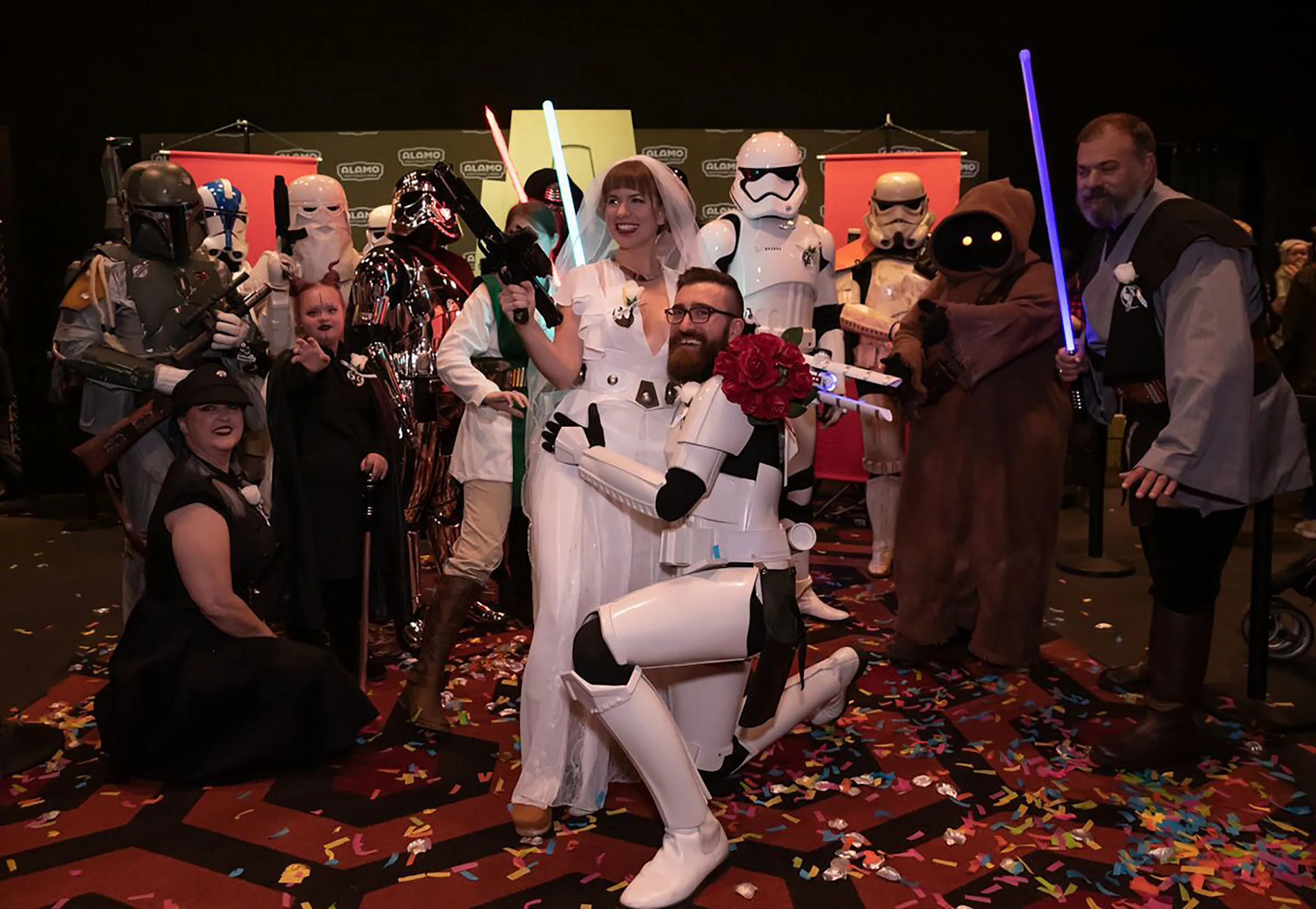Organised by the cinema chain (Alamo Drafthouse) themselves, the couples were surrounded by others costume wearers – all of whom share the same love for the Disney franchise. The couples were also greeted by John Williams’ iconic “Imperial March” music as they walked down the aisle at the cinema’s lobby where they would utter the words, “I do”.