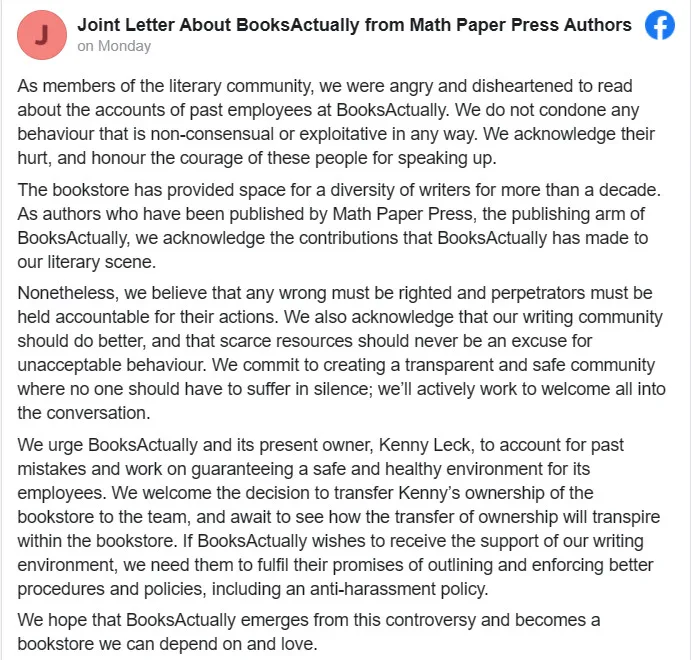 “As members of the literary community, we were angry and disheartened to read about the accounts of past employees at BooksActually. We do not condone any behaviour that is non-consensual or exploitative in any way. We acknowledge their hurt, and honour the courage of these people for speaking up.