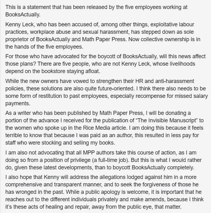 Prior to the release of this joint statement, Alfian also posted another post reflecting his thoughts that reads, “This is a statement that has been released by the five employees working at BooksActually. Kenny Leck, who has been accused of, among other things, exploitative labour practices, workplace abuse and sexual harassment, has stepped down as sole proprietor of BooksActually and Math Paper Press. Now collective ownership is in the hands of the five employees. For those who have advocated for the boycott of BooksActually, will this news affect those plans? There are five people, who are not Kenny Leck, whose livelihoods depend on the bookstore staying afloat. While the new owners have vowed to strengthen their HR and anti-harassment policies, these solutions are also quite future-oriented. I think there also needs to be some form of restitution to past employees, especially recompense for missed salary payments. As a writer who has been published by Math Paper Press, I will be donating a portion of the advance I received for the publication of “The Invisible Manuscript” to the women who spoke up in the Rice Media article. I am doing this because it feels terrible to know that because I was paid as an author, this resulted in less pay for staff who were stocking and selling my books. I am also not advocating that all MPP authors take this course of action, as I am doing so from a position of privilege (a full-time job). But this is what I would rather do, given these latest developments, than to boycott BooksActually completely. I also hope that Kenny will address the allegations lodged against him in a more comprehensive and transparent manner, and to seek the forgiveness of those he has wronged in the past. While a public apology is welcome, it is important that he reaches out to the different individuals privately and make amends, because I think it’s these acts of healing and repair, away from the public eye, that matter.”