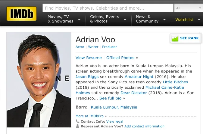 He decided to pursue acting seriously, so he decided to move to LA to enrol in the prestigious New York Film Academy. With talent, hard work, combined with good looks and a little advice from pop princess Britney Spears – Adrian Voo kicked off his Hollywood career and has graced the screens in an impressive number of movies and TV shows.