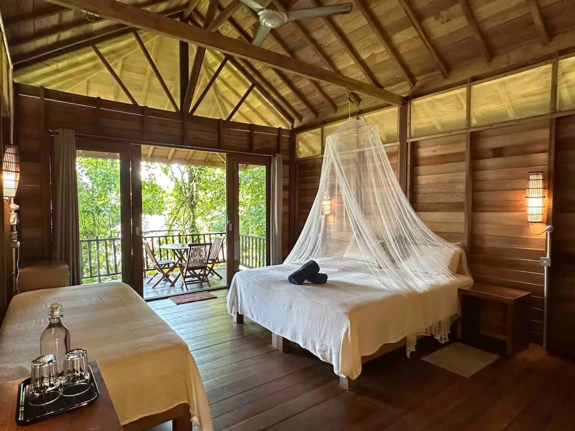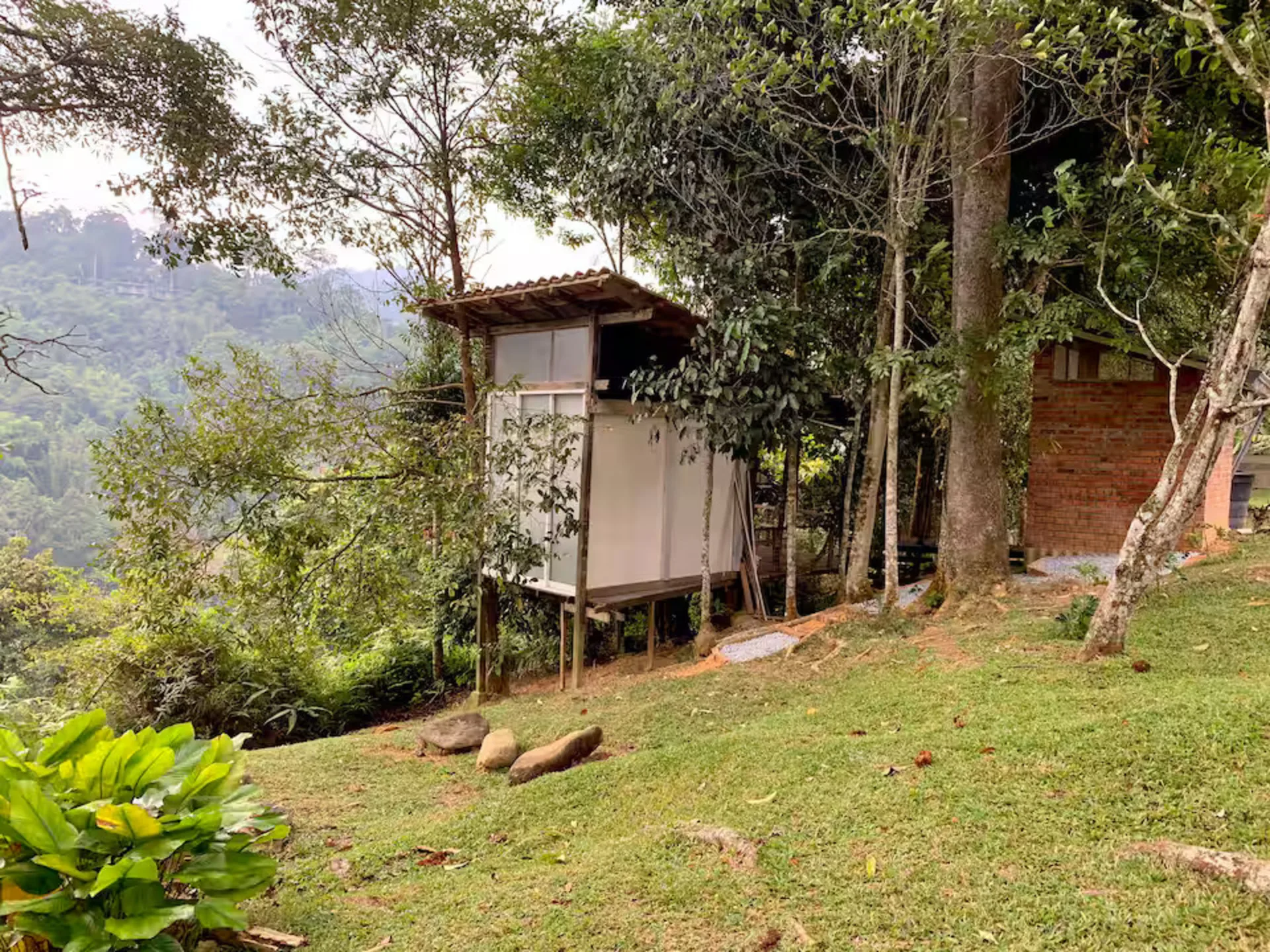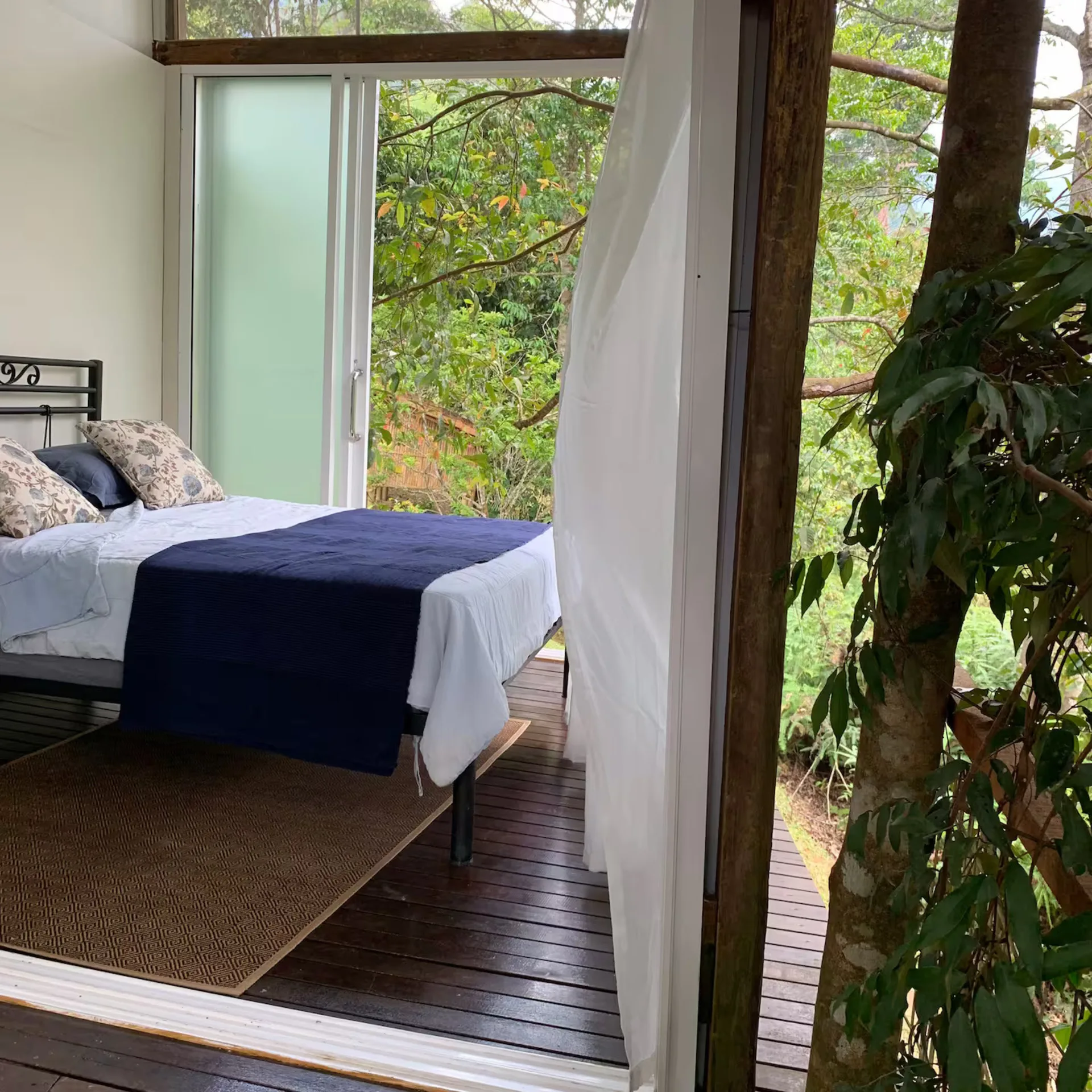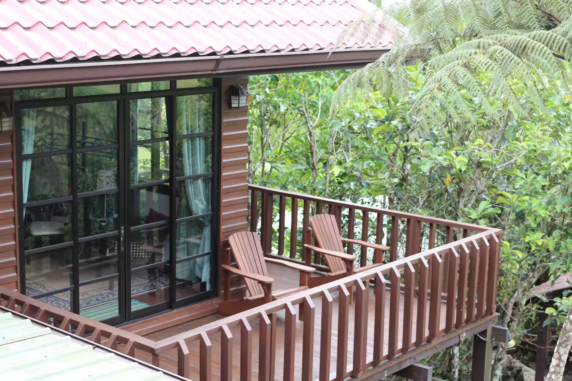 Surrounded by lush greenery and a natural stream, the cabin invites you to unwind in its spacious, tropical hardwood interiors, connected by elevated wooden pathways. Whether you’re enjoying the crisp mountain air on the balcony or cosying up indoors with a book, this getaway offers a tranquil escape far from the hustle of daily life.