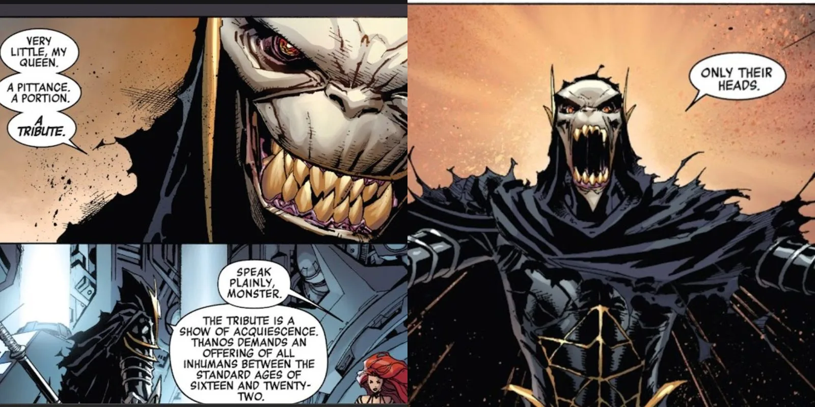Yet another example of a terrific Marvel character being reduced to the role of super-henchman is the lacklustre introduction of Thanos’ fanatical, death-worshipping servant, Corvus Glaive into the MCU. He is the leader of the Black Order and Thanos’ second-in-command over his armies. First introduced in Jonathan Hickman’s “Infinity” comic book event, Corvus Glaive made an immense impression on readers with his threat to the King of the Inhumans, Black Bolt. With cruel glee and unwavering fervour, he demands that all Inhumans between the ages of sixteen to twenty-two years old be given to him. When asked by the Inhuman queen what they could offer him he chillingly responds “Only their heads”.