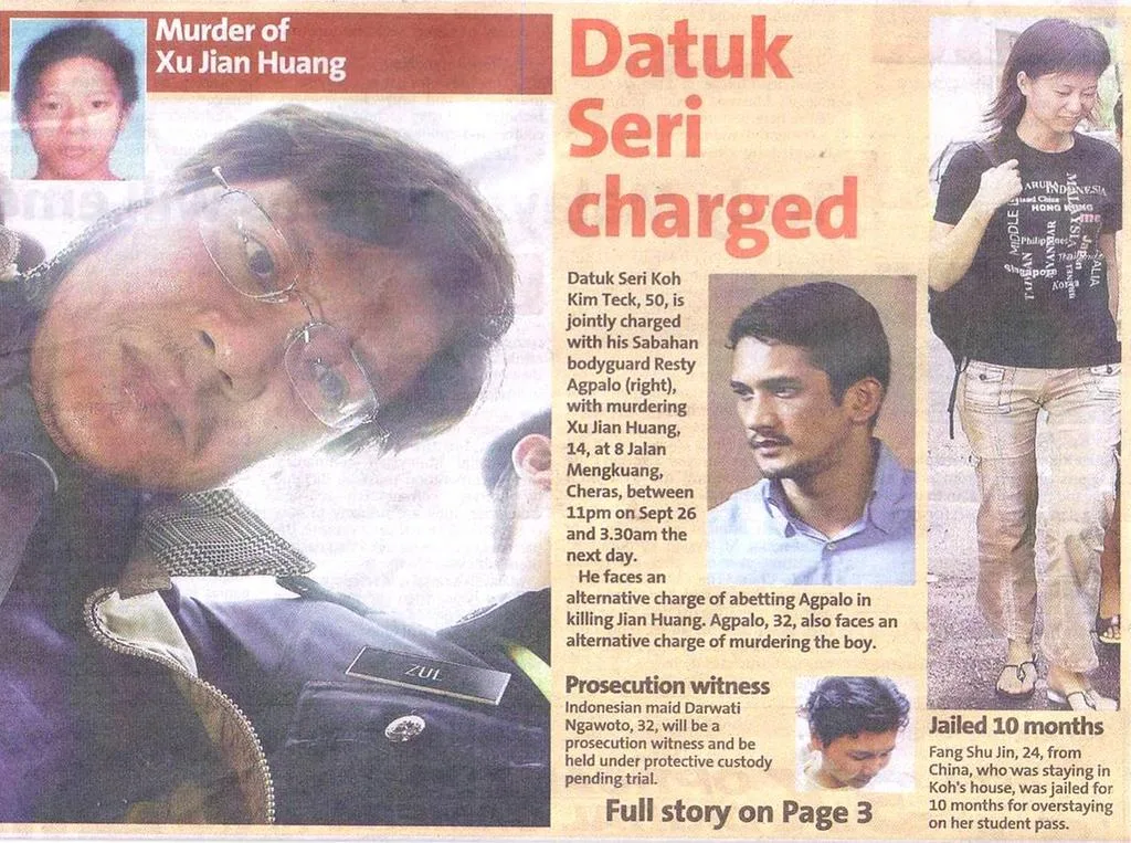 However, this was not an accidental drowning case, as the boy’s limbs were bound and there were multiple bruises on his body. The case was classified as a murder, and the main suspects were his uncle, Koh Kim Teck, the bodyguard Resty Agpalo, and driver Mohd Najib Zulkifli.
