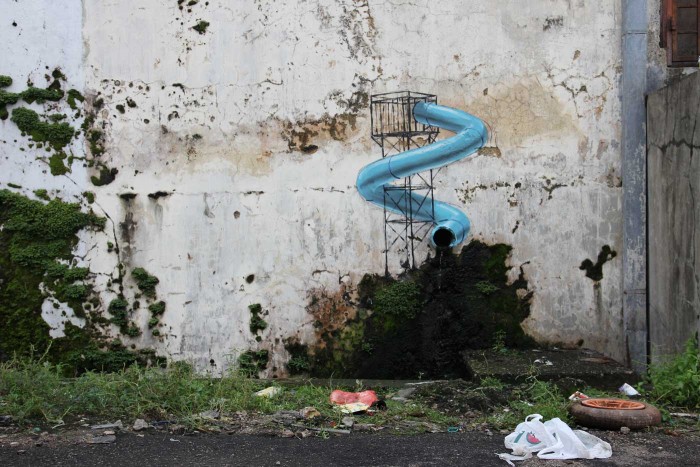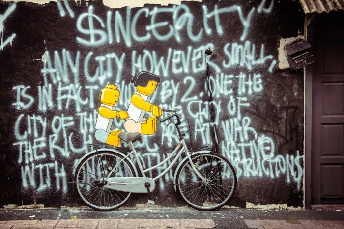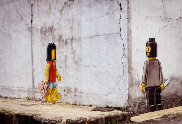 From Penang to Ipoh, to Kuala Lumpur and even all the way down to Johor Bahru, Ernest Zacharevic is on a Malaysian street art domination streak! In 2012, Johor Bahru officially became home to LEGOLAND Malaysia, Malaysia’s first international theme park. Also Asia’s first LEGOLAND. As such, Ernest went to town with controversial LEGO-themed street art! Some of which were removed but because of his work, the Johor Bahru authorities have even considered creating a special graffiti wall to allow street art (subject to their approval).
