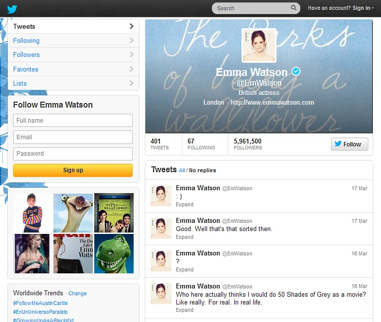Almost immediately, Emma Watson herself took it to her Twitter account to deny (future) starring in the film adaption of the first book of E.L. James’ erotic trilogy’s rumours. She tweeted: