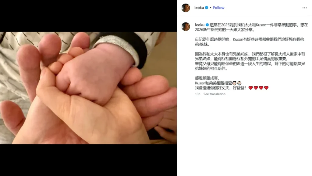The new year started with a blessing for Hong Kong star Leo Ku (古巨基) and wife Lorraine Chan. On 1st January 2026 (Thursday), the singer announced the new addition to his family: his second son.