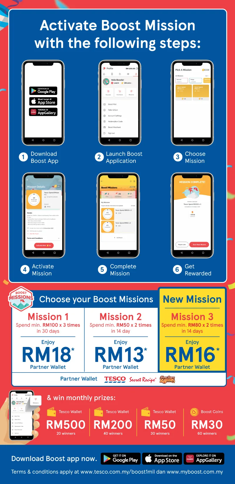- Complete specific missions using Boost E-wallet to get cashback rewards up to RM23