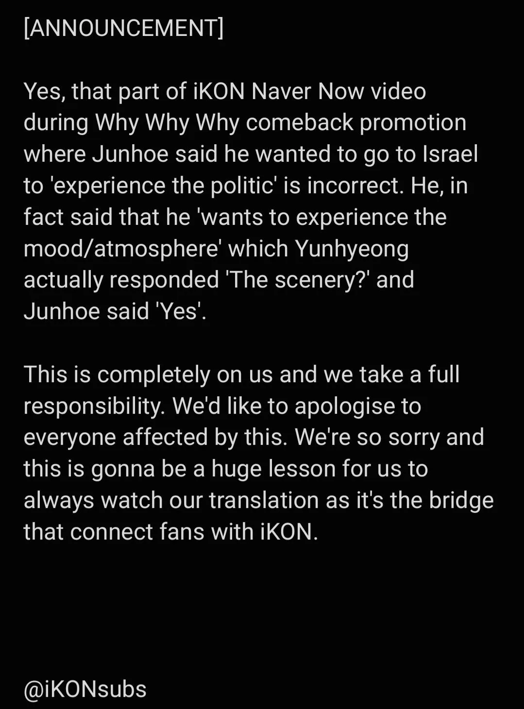 This incident was not recent but an old clip of the iKON member recently resurfaced that showed him expressing his interest in wanting to visit Israel. When asked about why he chose the location, in the subtitles shown, he answered that he wanted to “experience the country’s politics”.