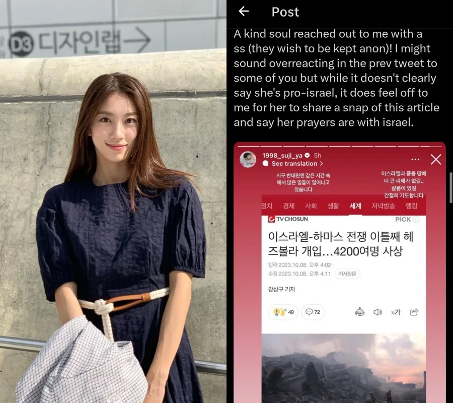 Lee Suji is a former member of K-pop girl group The Ark (2015) and then later Uni. T (2018). The idol recently posted an IG story of a news headline about the war along with a caption where she offered her prayers to the people of Israel.