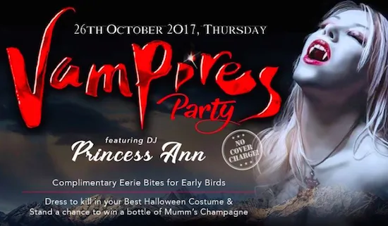 View Rooftop promises party-goers a night full of fangs and blood while they party with crowd-favourite DJ, Princess Ann. Entrance is free, and you can enjoy vampire-themed Eerie Bites on the house. There are also special cocktails and bottles promo available – and the best dressed vampire gets a bottle of champagne!