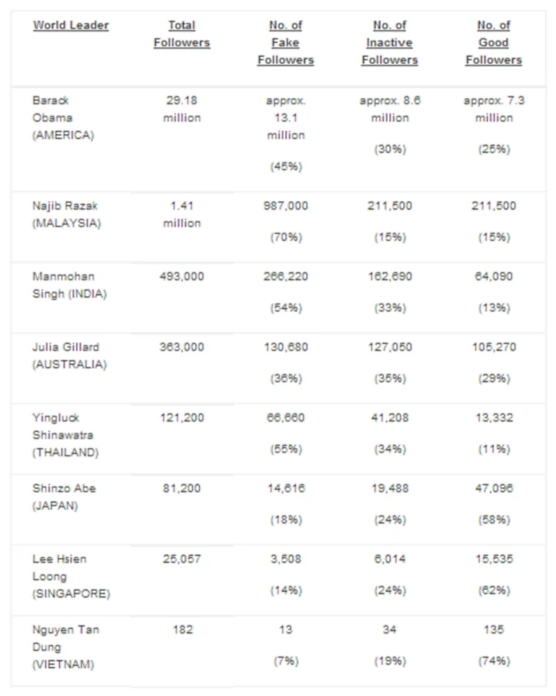 He was followed by Thai Prime Minister Yingluck Shinawatra and Indian Prime Minister Manmohan Singh at 55% and 54% respectively. Just under half of US President Barack Obama’s 13.1 million followers were found to be fake, and for Australian Prime Minister Julia Gillard, 36% of her 130,680 followers were fake.
