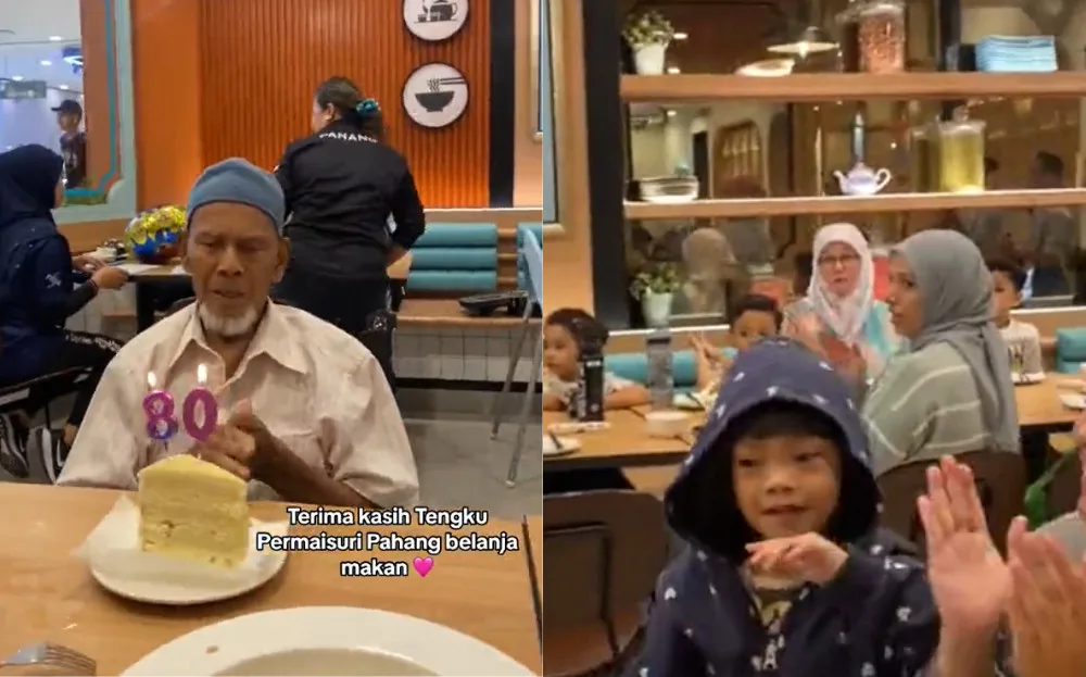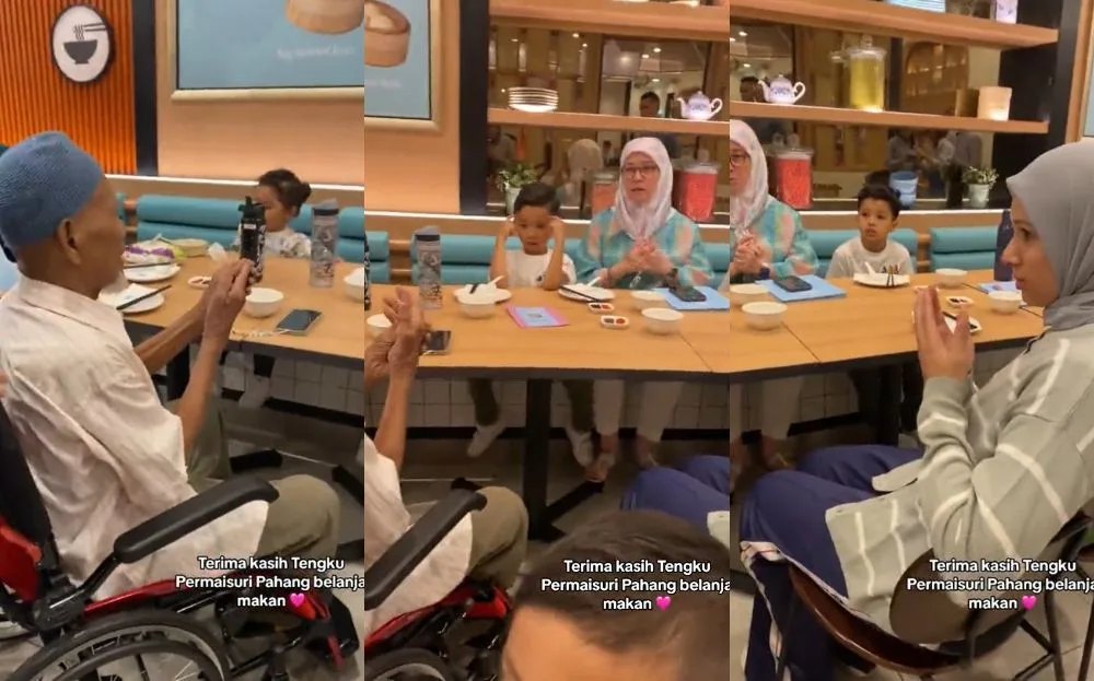 TikTok user @/jafniel71 recently shared a video of his elderly relative celebrating his 80th birthday at the Dolly Dim Sum restaurant at East Coast Mall in Pahang. However, spotted in the background was the former queen of Malaysia, Tengku Ampuan Pahang Tunku Azizah Aminah Maimunah Iskandariah, who was dining at the restaurant with her daughter-in-law and grandchildren. Tunku Azizah even joined the rest of the crowd at the restaurant as they sang a birthday song for the man. After the song ended, the man turned towards Tunku Azizah to show his gratitude for celebrating his special day with him.