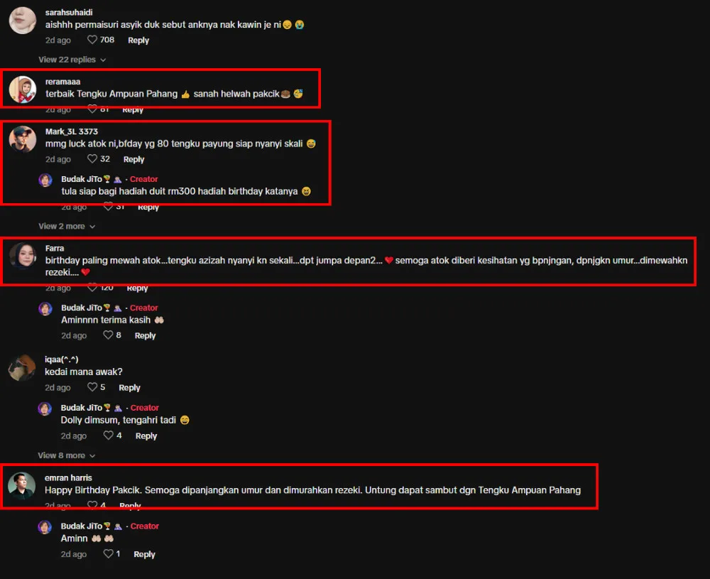 The video also revealed that Tunku Azizah offered to pay for the family’s meal as a treat for the man. As a token of appreciation, the 80-year-old said a short prayer for the Tengku Ampuan of Pahang and her family. The TikTok user also revealed in a reply to a comment that the senior citizen even received a RM300 birthday gift from Tunku Azizah, proving her generosity.