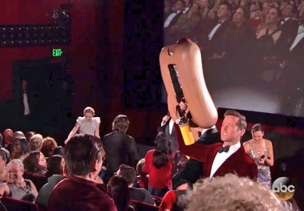 While the snacks were being handed out, Armie Hammer wasted no time in shooting hot dogs into the crowd with his hot dog-shaped hot dog cannon. “Do not aim the hot dogs at the vegetarians,” Kimmel warned. “This is better than Halloween.”