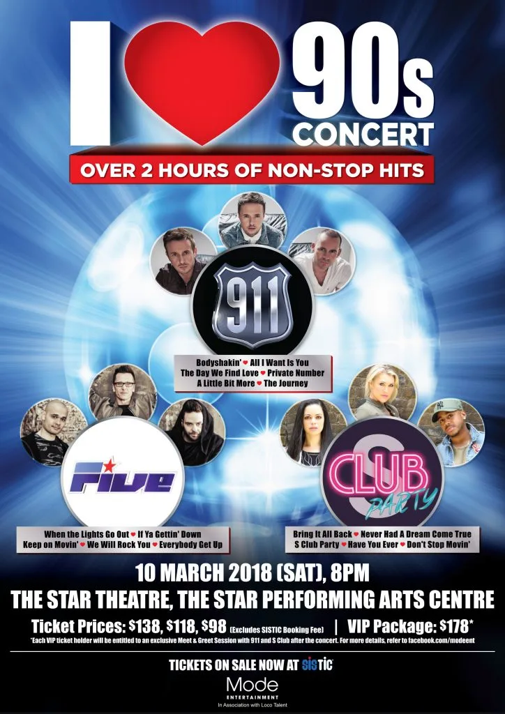 Scheduled for 8pm on 10th March 2018 at The Star Theatre in Singapore, the show will feature over 2 hours of your favourite 90s hits, performed by English pop group 911 (Lee Brennan, Jimmy Constable, and Simon “Spike” Dawbarn), English boyband 5IVE (Sean Conlon, Ritchie Neville, Scott Robinson), and the one and only S Club (S Club 7 members Tina Barrett, Bradley McIntosh, Jo O’Meara).