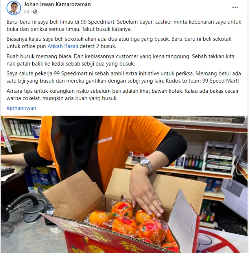 A few days ago, Facebook user Johan Irwan Kamarozaman posted a story of what he experienced during his shopping trip at his local 99 Speedmart. The CEO of LEAP Integrated Solutions was buying a box of oranges and when he placed the item at the checkout counter, the cashier asked for his permission to open the box so she could examine the oranges.