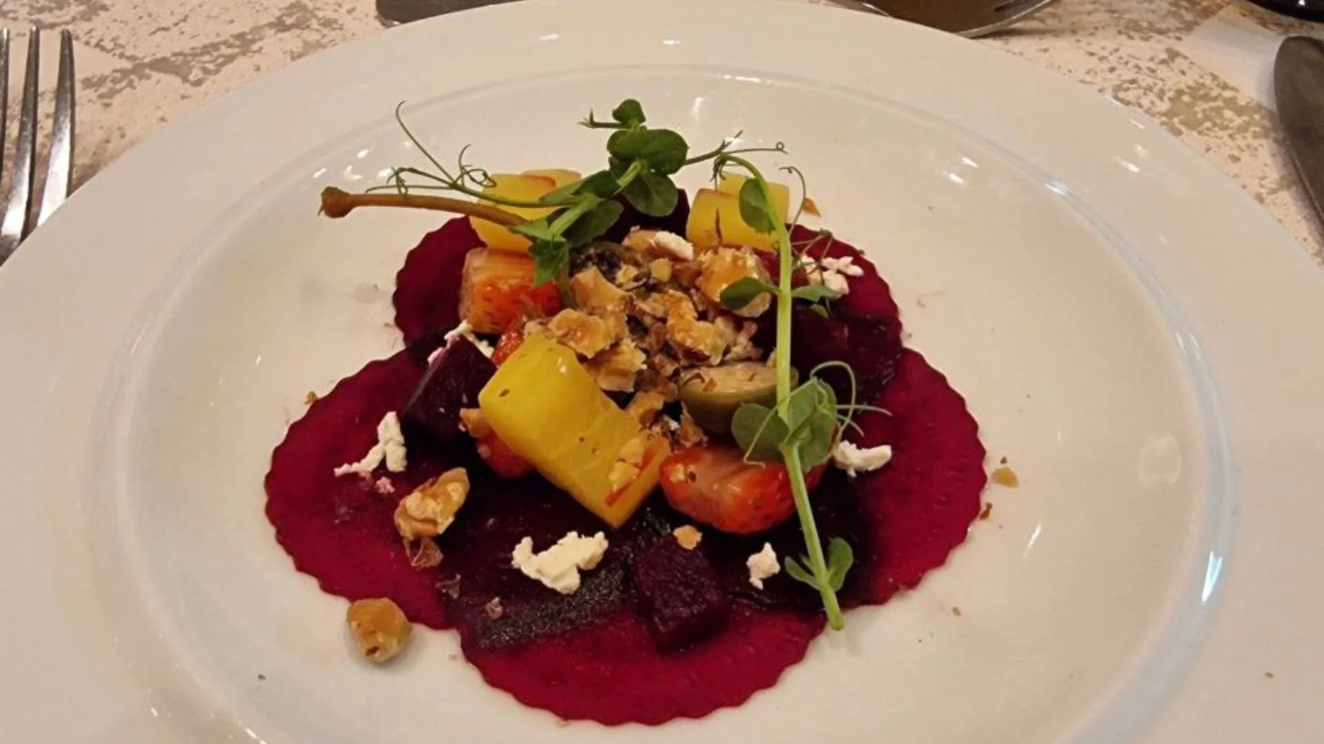 - Beetroot and Strawberry Salad, Feta Cheese Crumble and Toasted Walnut