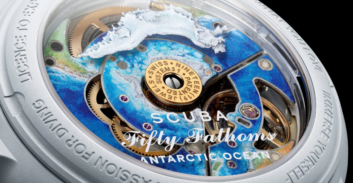 Another noteworthy reference can be found on the ANTARCTIC OCEAN model: a genuine water contact indicator that detects the presence of water. Since 1954, Blancpain has added this feature to some of its models intended for use by diving clubs and military units. Placed at 6 o’clock on the dial, the sensor ensures that the watch’s water resistance has not been affected by the previous diver’s use. A change in sensor color would indicate a trace of moisture. A number of Fifty Fathoms models equipped with the two-color sensor bear the name “MIL-SPEC”, in accordance with US Navy specifications.