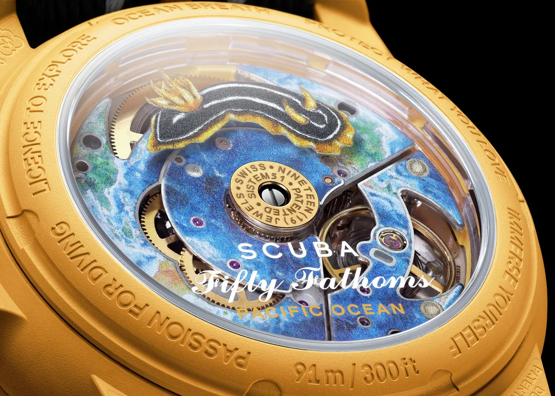 The shared Blancpain X Swatch logos can be found on the dial and crown. The word “Swatch” is also inscribed on the case, just as “Blancpain” is inscribed on the original Fifty Fathoms watches. The back of the watch features inspirational inscriptions like PASSION FOR DIVING – LICENCE TO EXPLORE – OCEAN BREATH – PROTECT WHAT YOU LOVE and IMMERSE YOURSELF.