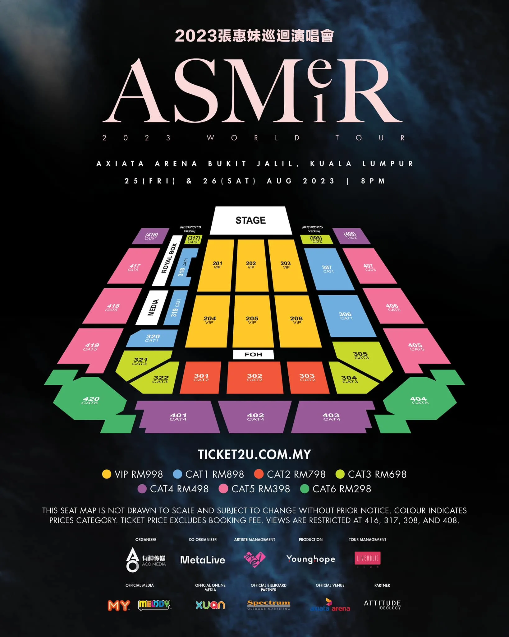 - Ticketing: VIP RM 998 | CAT1 RM 898 | CAT2 RM 798 | CAT3 RM 698 | CAT4 RM 498 | CAT5 RM 398 | CAT6 RM 298
