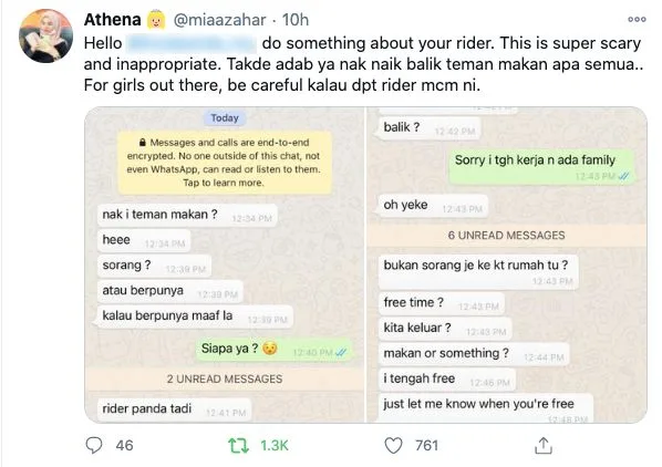 Based on the screen capture of the conversation shared by Mia, the rider apparently attempted to make an advance by offering to accompany Mia, while she ate her meal in her apartment. Despite being rejected, the man persisted and even went as far as to ask Mia out. Seemingly had enough of the rider, Mia ended up ignoring his texts.