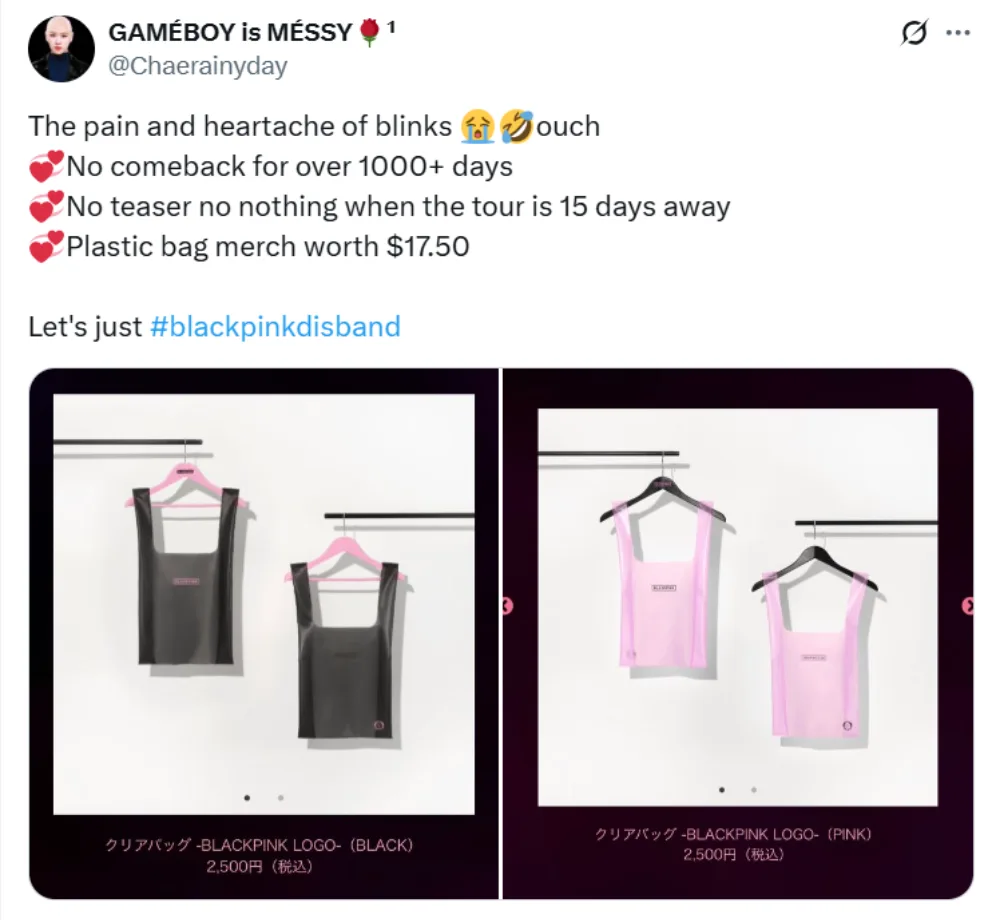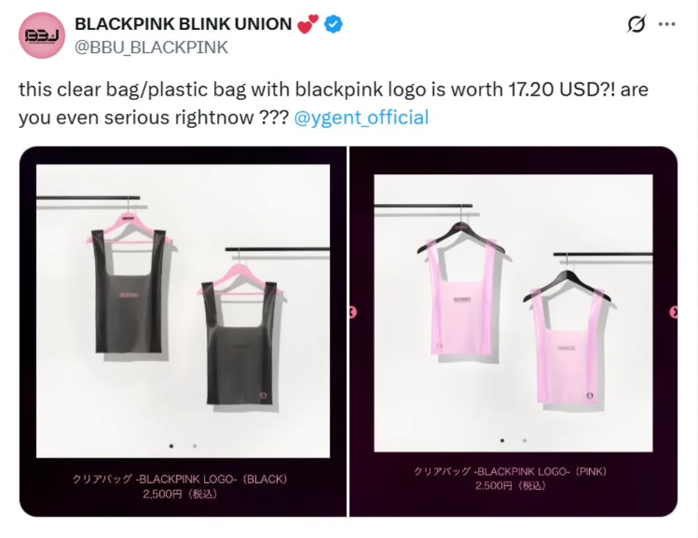 As it turns out, the products for sale consisted of the usual t-shirts, caps and cheering towels with the group and the tour’s logo. However, the product that angered BLINKS (BLACKPINK fans) the most was a clear bag made of thermoplastic polyurethane (TPU), a.k.a plastic, with the BLACKPINK logo. More shockingly, the pop-up sells the plastic bag for 2,500 yen (approximately RM74) each.