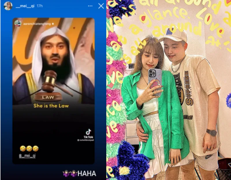 Aaron recently uploaded a TikTok video on his Instagram Story, while tagging Mei Qi. The reason for tagging her soon became clear, Aaron was teasing her. The video showed a comedian saying, “If you have a wife, what does she become? She is the law.”