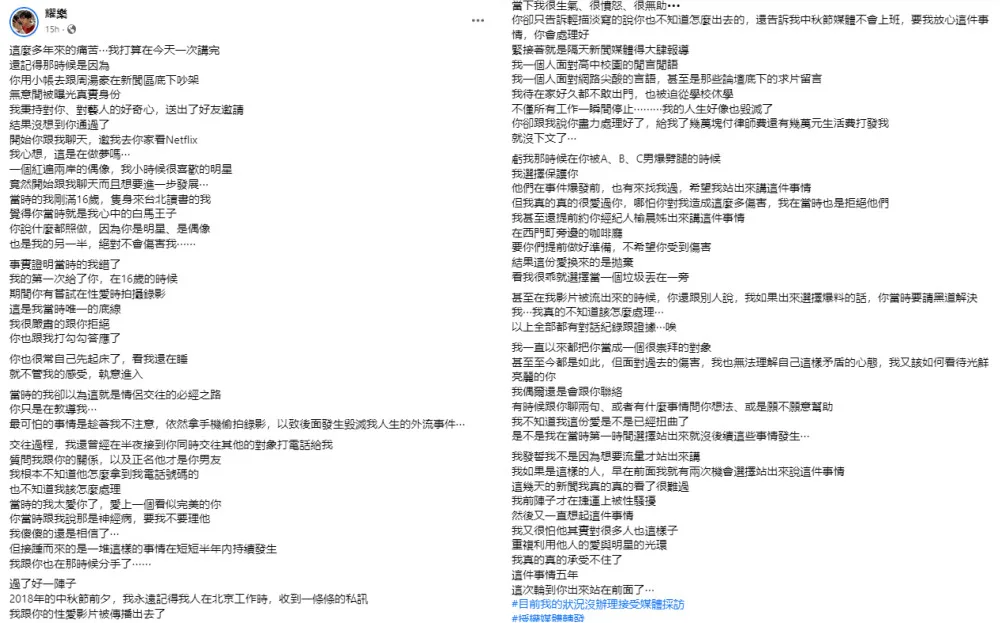 “On the eve of the Mid-Autumn Festival in 2018, I was working in Beijing when I received a private message. My sex film with you had gone viral,” he said. “I was very angry and very helpless at that moment.” Aaron had apparently filmed him without his knowledge and the videos had gotten leaked. The artist later promised him he would take care of the issue, even shelling out ten of thousands of yen to cover the legal fees and living expenses.