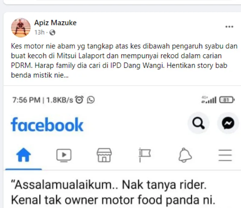 According to Apiz, the owner apparently got into some trouble with the law. He explained that the supposed Foodpanda rider was arrested by the police after getting caught being under the influence of Methamphetamine and for causing a scene at Mitsui LaLaport. He apparently was also on the PDRM’s wanted list.