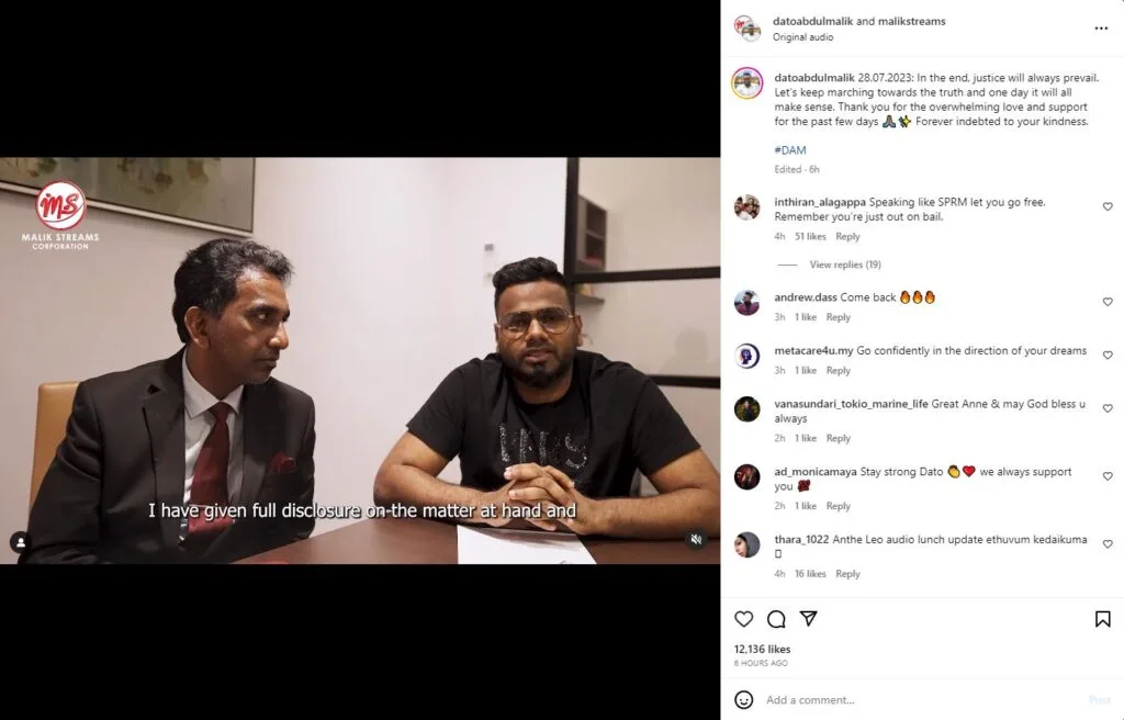 Today (28th July), Dato Malik uploaded a video on his Instagram to shed some light on the issue. Accompanied by his lawyer, Dato Malik firmly stated: “I have given full disclosure on this matter and will continue providing all the information needed to help (resolve) the case.”