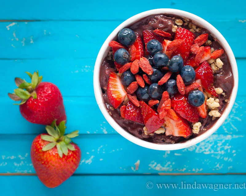 An açaí bowl is basically a really thick smoothie topped with oatmeal or granola, nuts, chia seeds, goji berries, shredded coconut, freshly cut fruits, or peanut butter. One bowl will keep you happily full for hours and satisfy your sweet craving at the same time. So you can imagine why we’ve always wanted to wolf down a bowl or 2 ourselves.