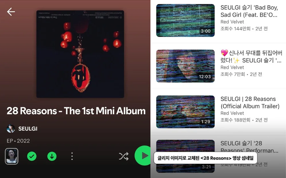 The planning for the comeback has also received traction for its attention to detail. Before the release of the first teaser, fans noticed “glitches” in some of Seulgi’s previous releases, like how the cover art for her debut album, “28 Reasons”, was flipped upside down on all music streaming platforms. Some noted that these “mistakes” ties back to the album’s title.
