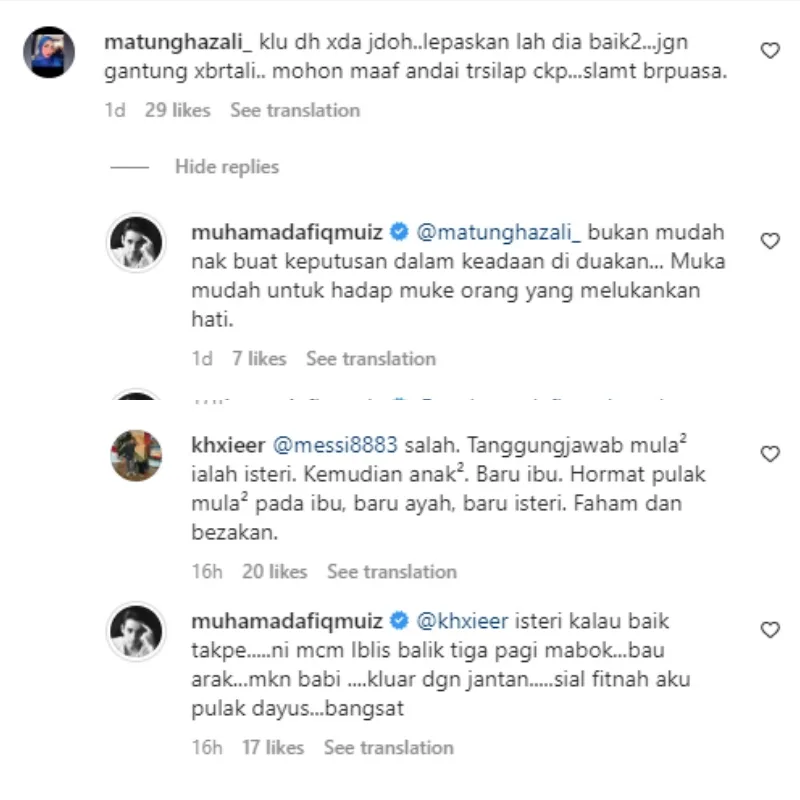 He didn’t stop there as the “Cinta Maya” star continued to declare that the public don’t know what goes on behind closed doors. Another netizen wrote a comment advising the public figure to release his wife and not delay the divorce process, to which he replied, “It’s not easy to make a decision for someone in my case. It’s hard to face the person who’s hurt you”.
